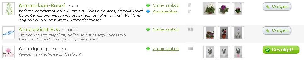 Zodra het aanbod helemaal naar wens in uw systeem verschijnt, kunt u kwekers gaan selecteren om elektronisch aanbod van te ontvangen. Wij noemen dit 'kwekers volgen'. Op de pagina FloraXchange.nl/Connectie/KwekersVolgen ziet u een overzicht van aangesloten kwekers die u kunt volgen.